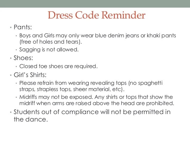 Post a Comment for "Business Casual Dress Code Policy Template - Freshman Dance Dress Code -- Welcome to the Jungle : Professional dress code policy template."